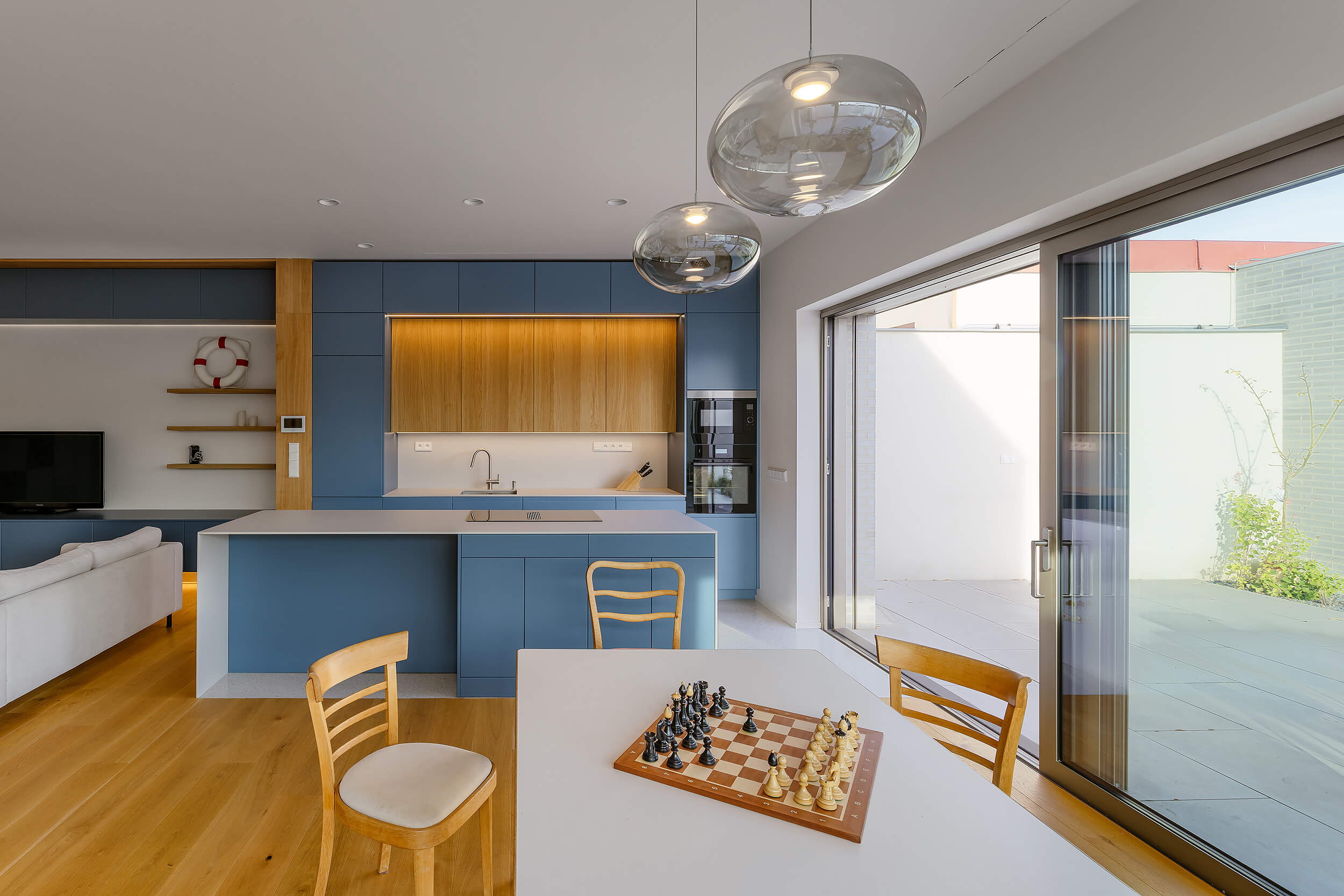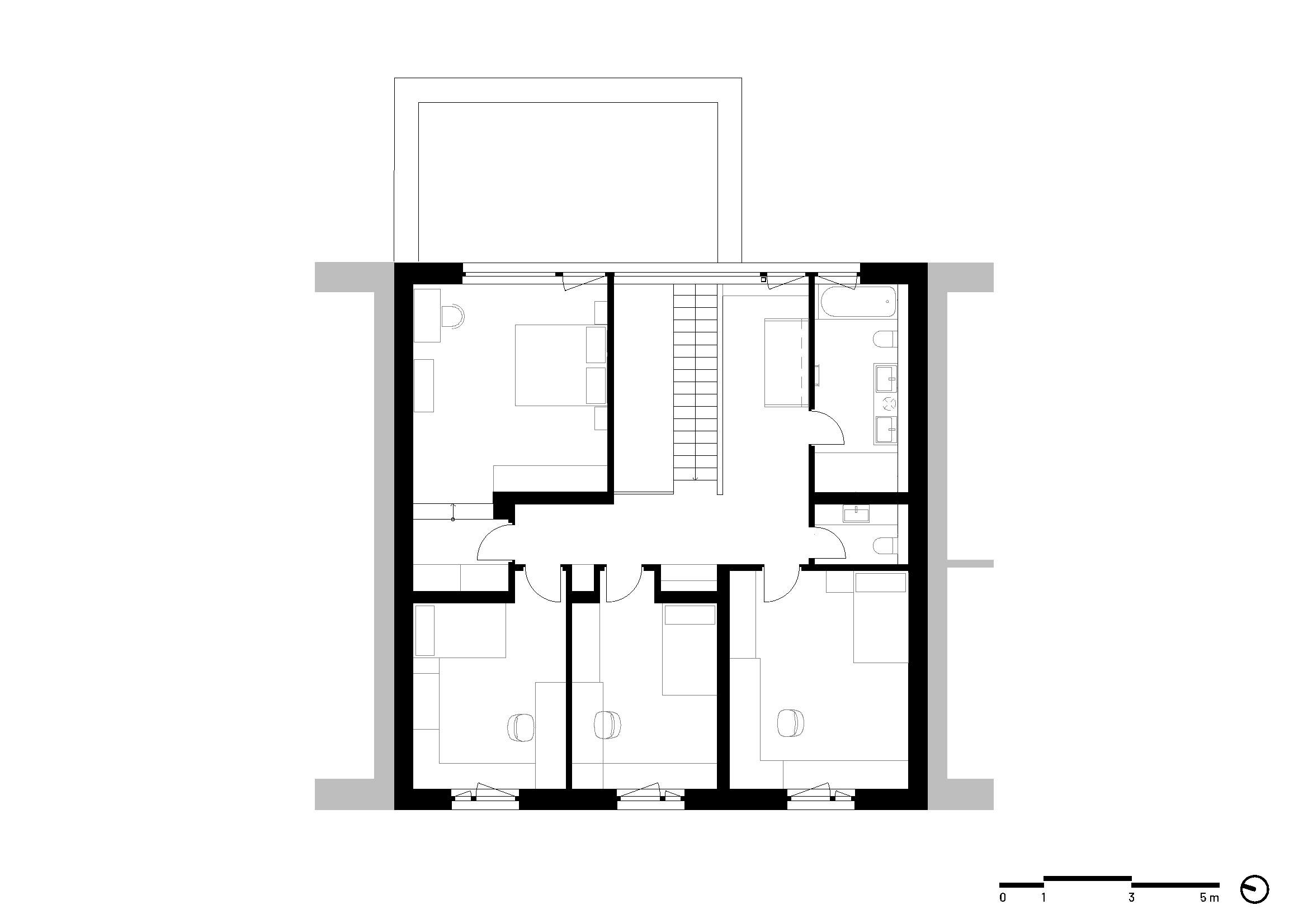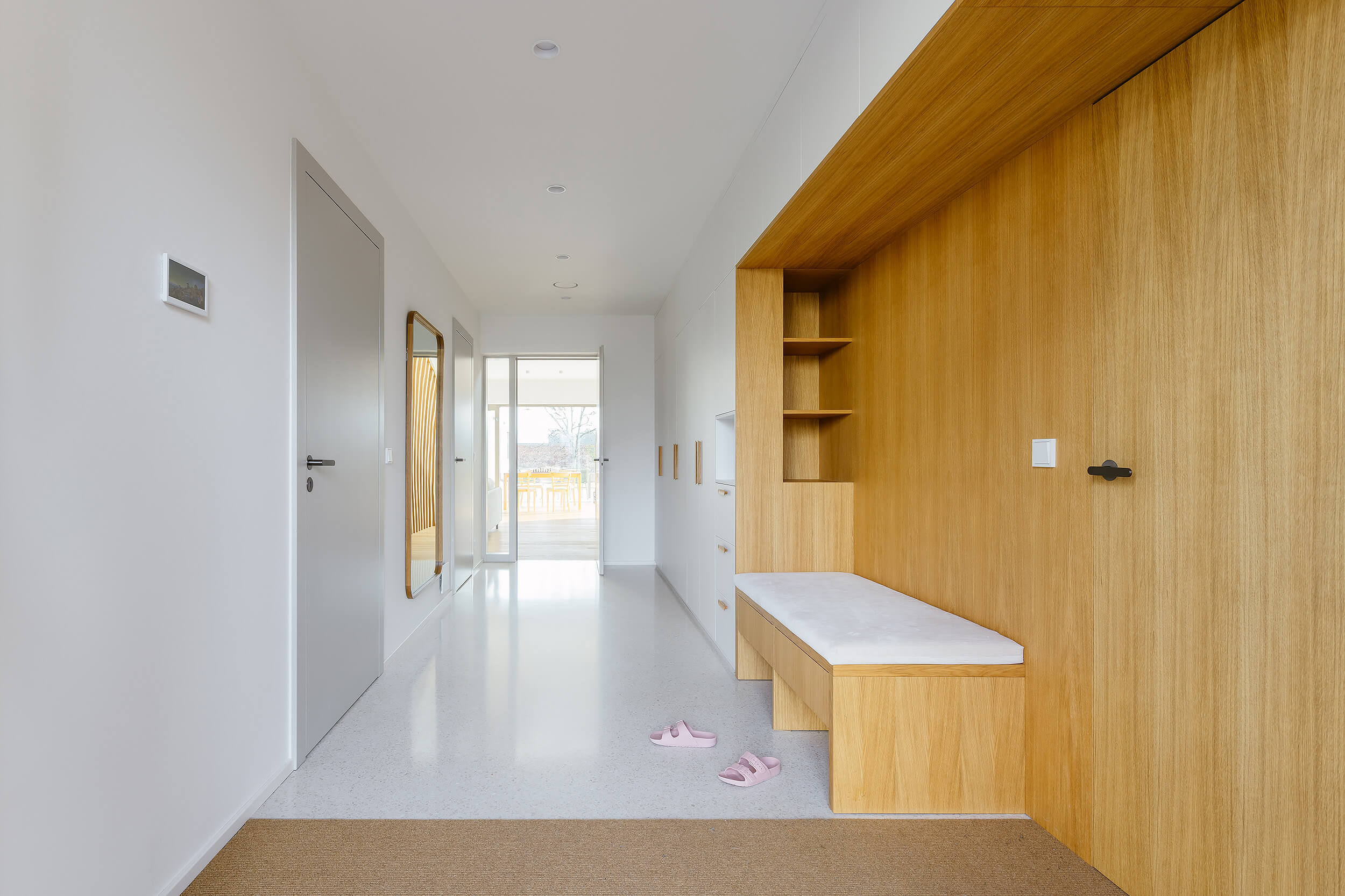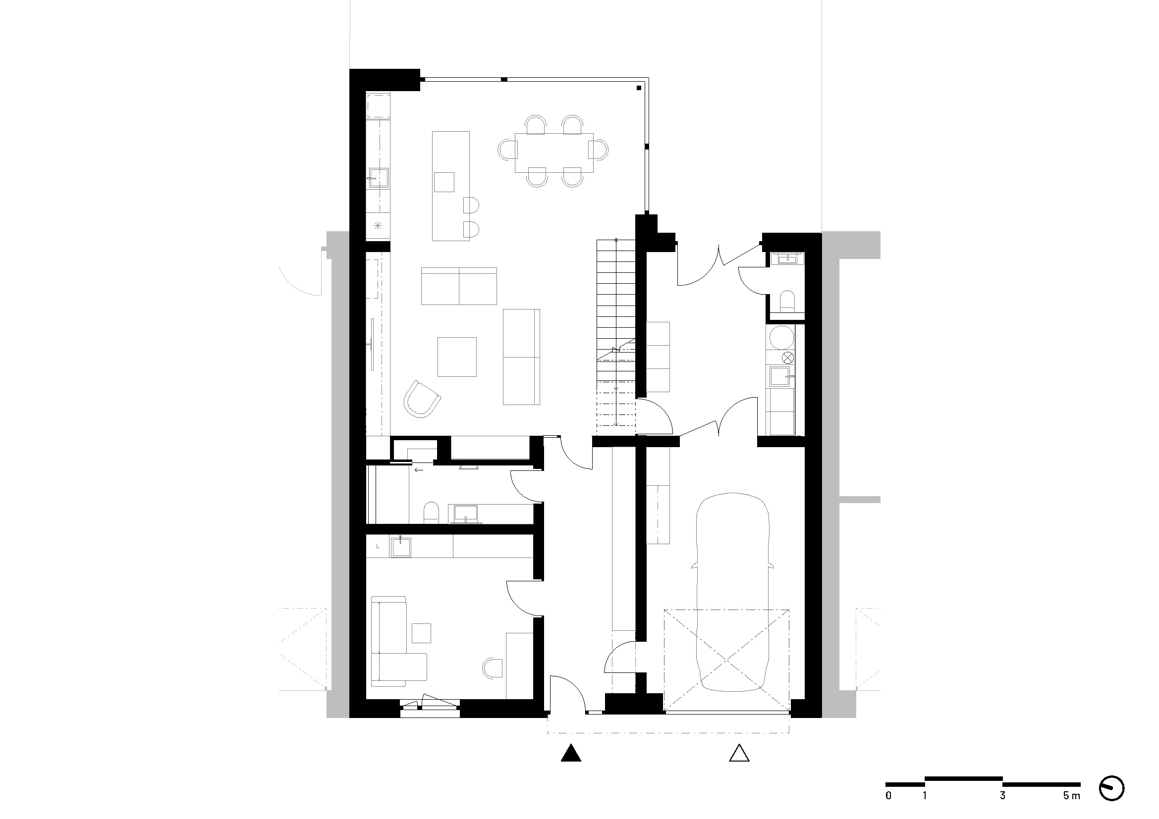 Dispozice domu je založena na otevřeném obytném prostoru orientovaném do zahrady. Po vstupu do domu se obytná část otevírá v celé své hloubce a v průhledu směřuje až do zahrady, která se tak stává přirozenou součástí každodenního života i atmosféry interiéru. Provozní řešení doplňuje přímá vazba garáž – technická místnost – zahrada, která umožňuje vstup na terasu a do exteriéru bez nutnosti procházet obytnou částí.