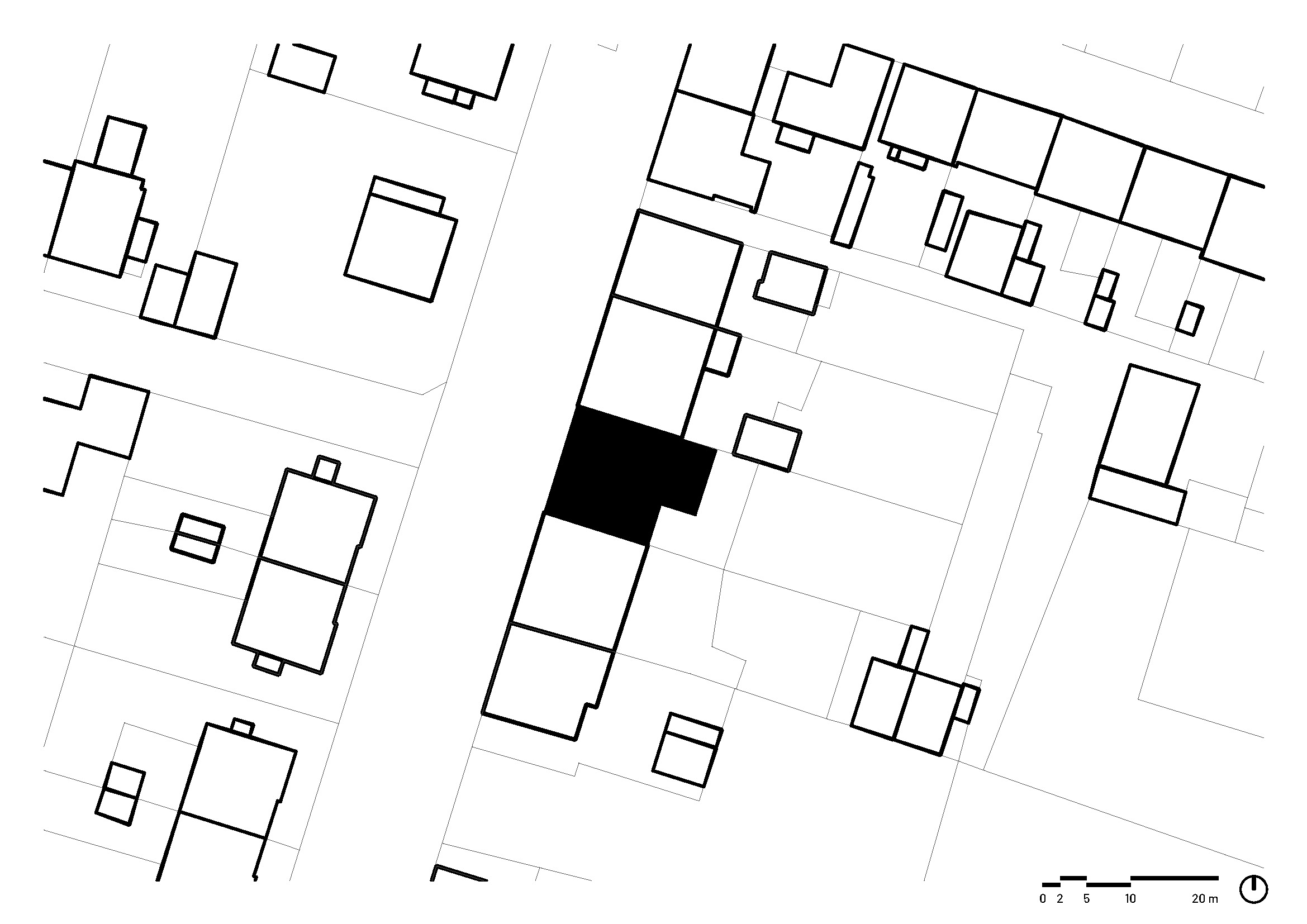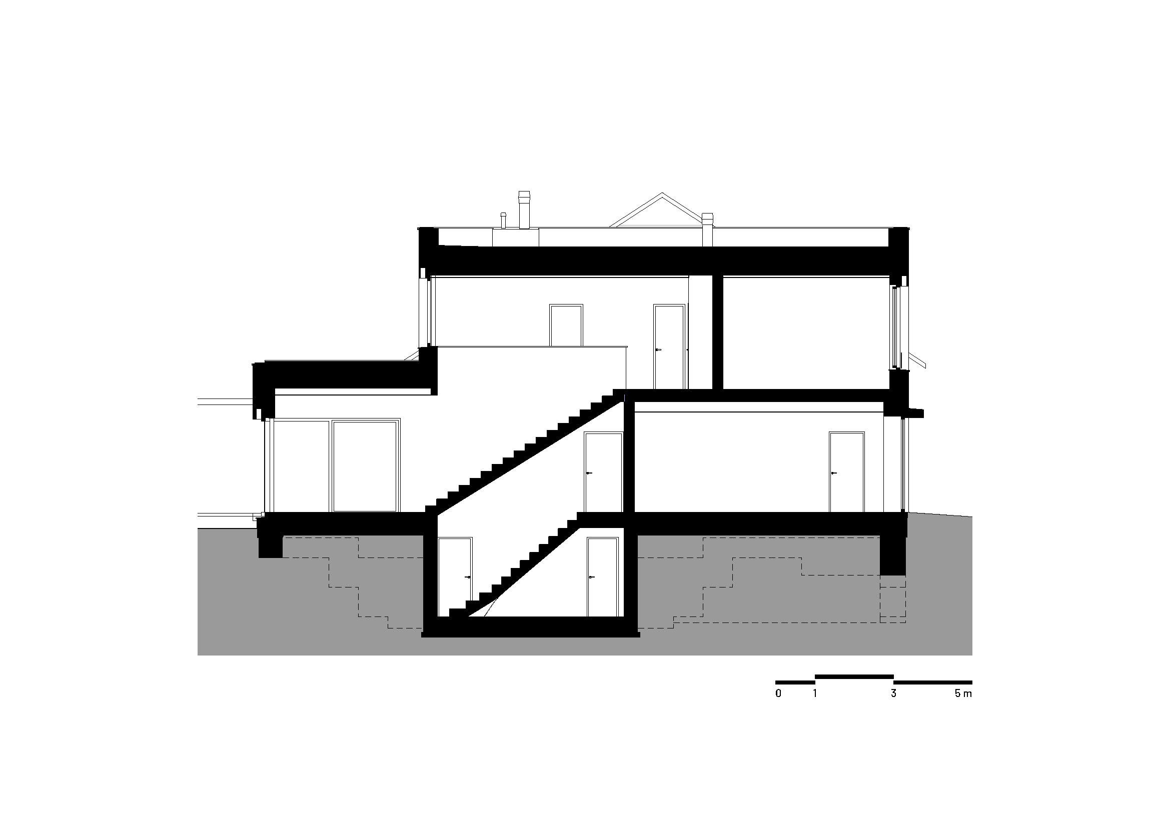 Návrh pracuje se dvěma základními hmotami. Hlavní dvoupodlažní objem vymezuje dům vůči ulici, nižší jednopodlažní část rozvíjí obytný prostor směrem do zahrady a přivádí každodenní život blíž venkovnímu pobytu. Spolu se zahradním domkem tak vzniká chráněné venkovní zázemí, které nabízí potřebnou míru soukromí i v těsném kontaktu s okolní zástavbou.