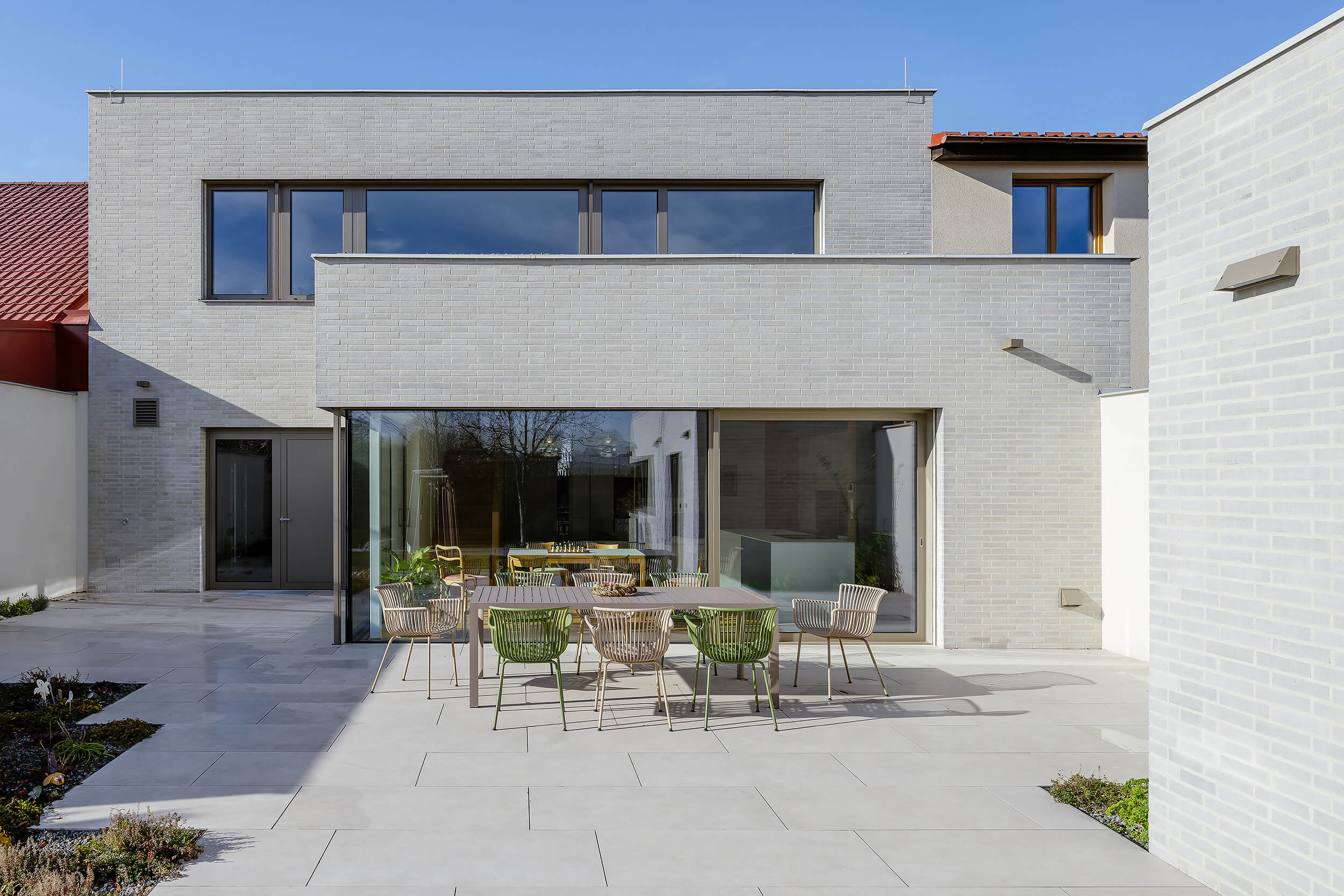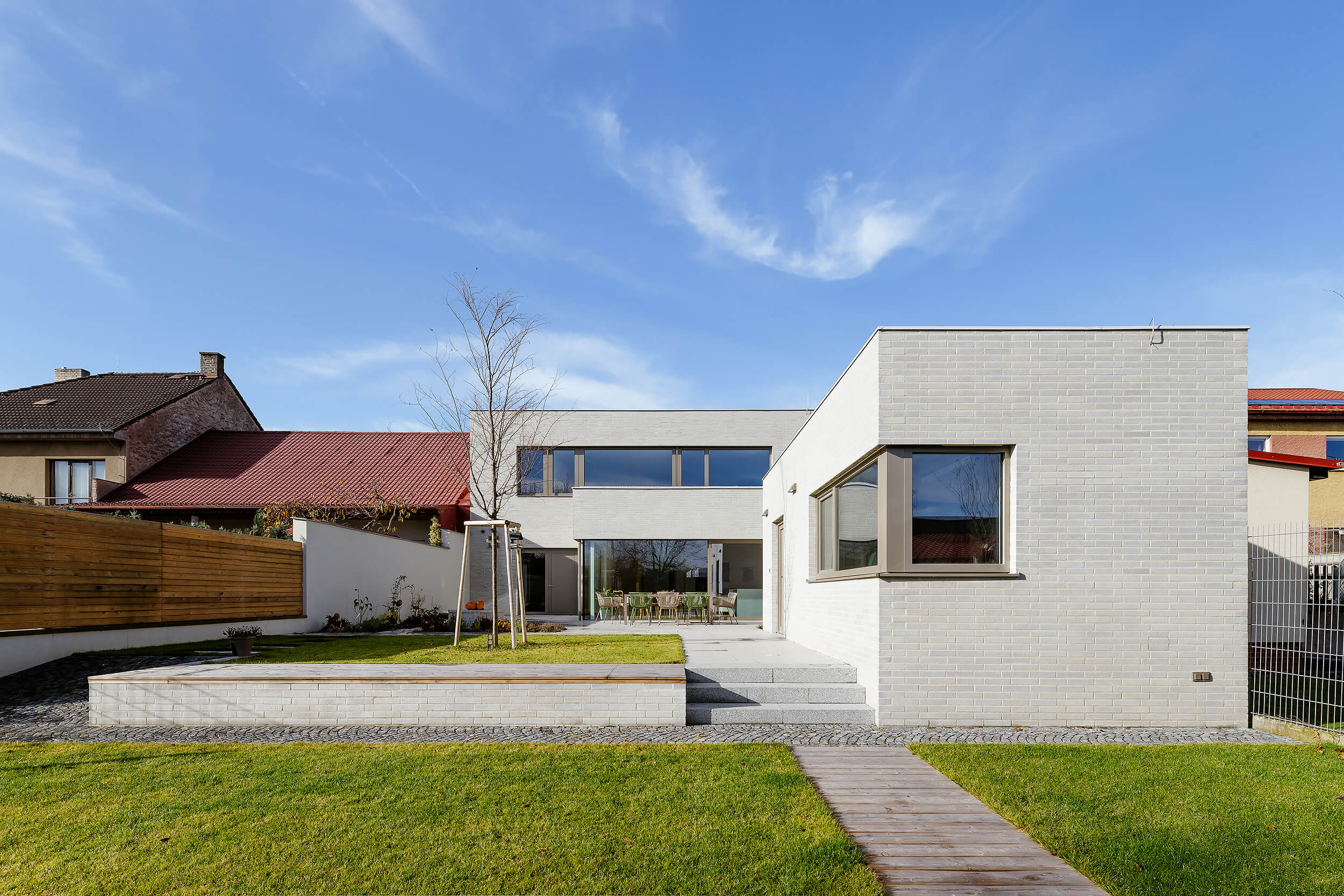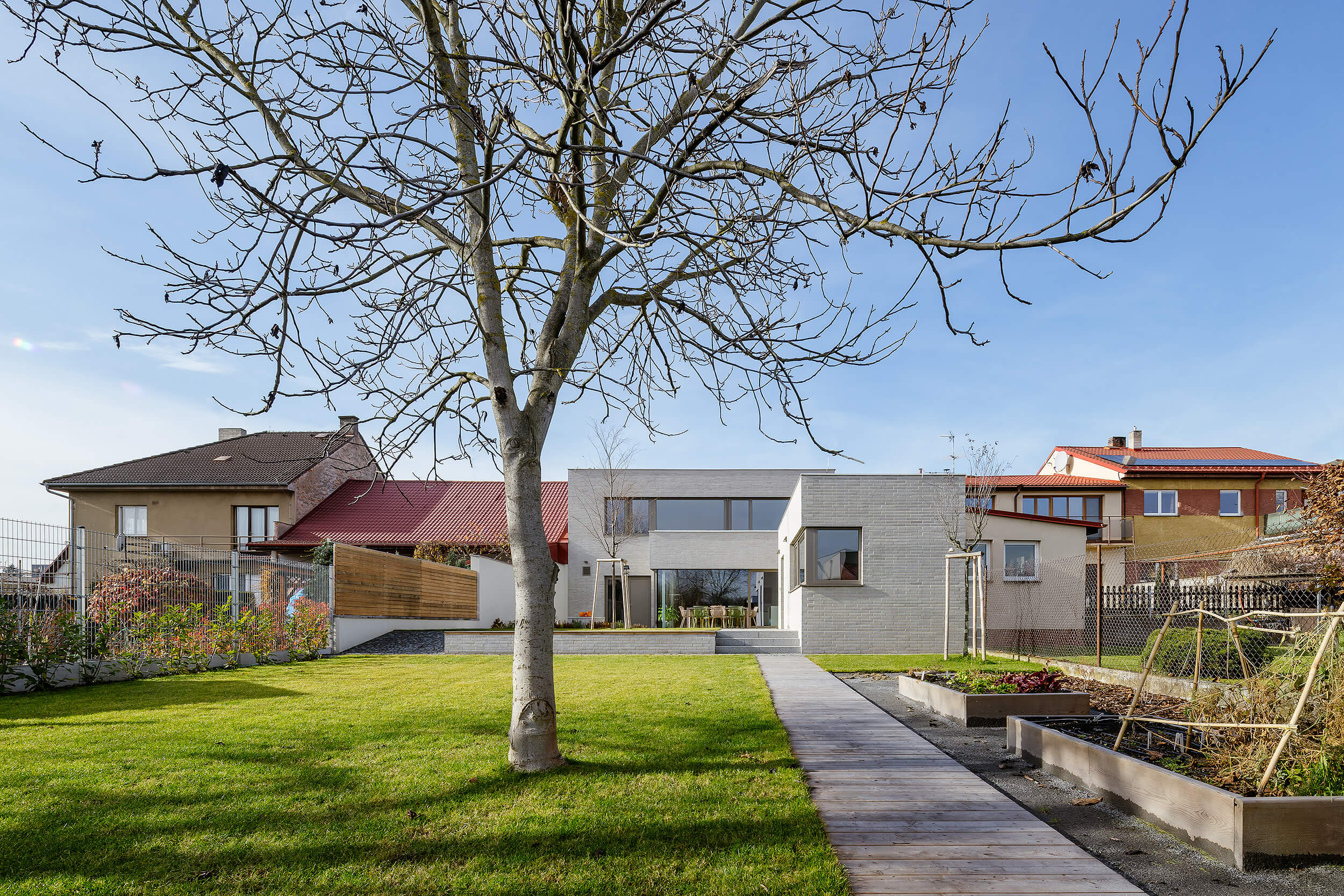 Do ulice působí poměrně uzavřeně a drží kompaktní výraz, směrem do zahrady se naopak otevírá a obrací se do klidnější části pozemku.