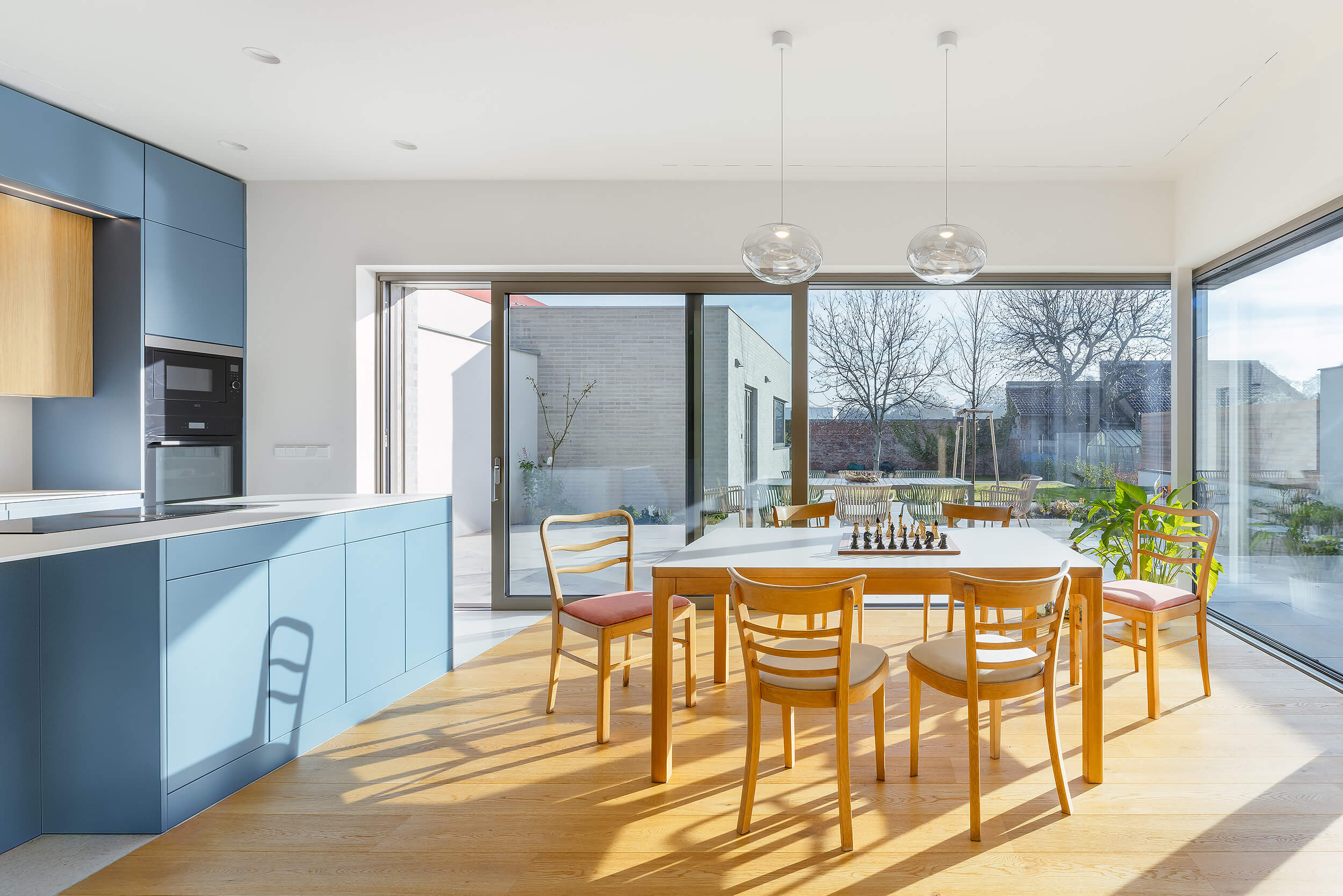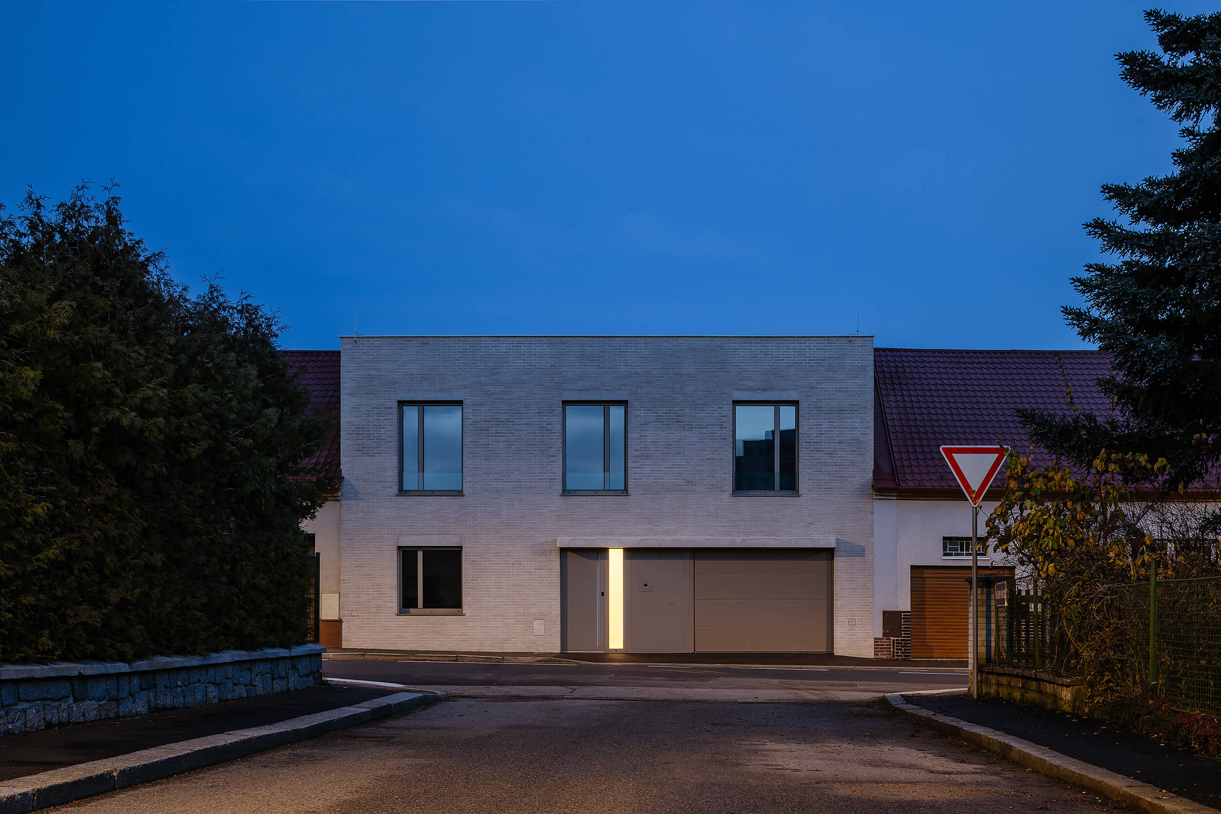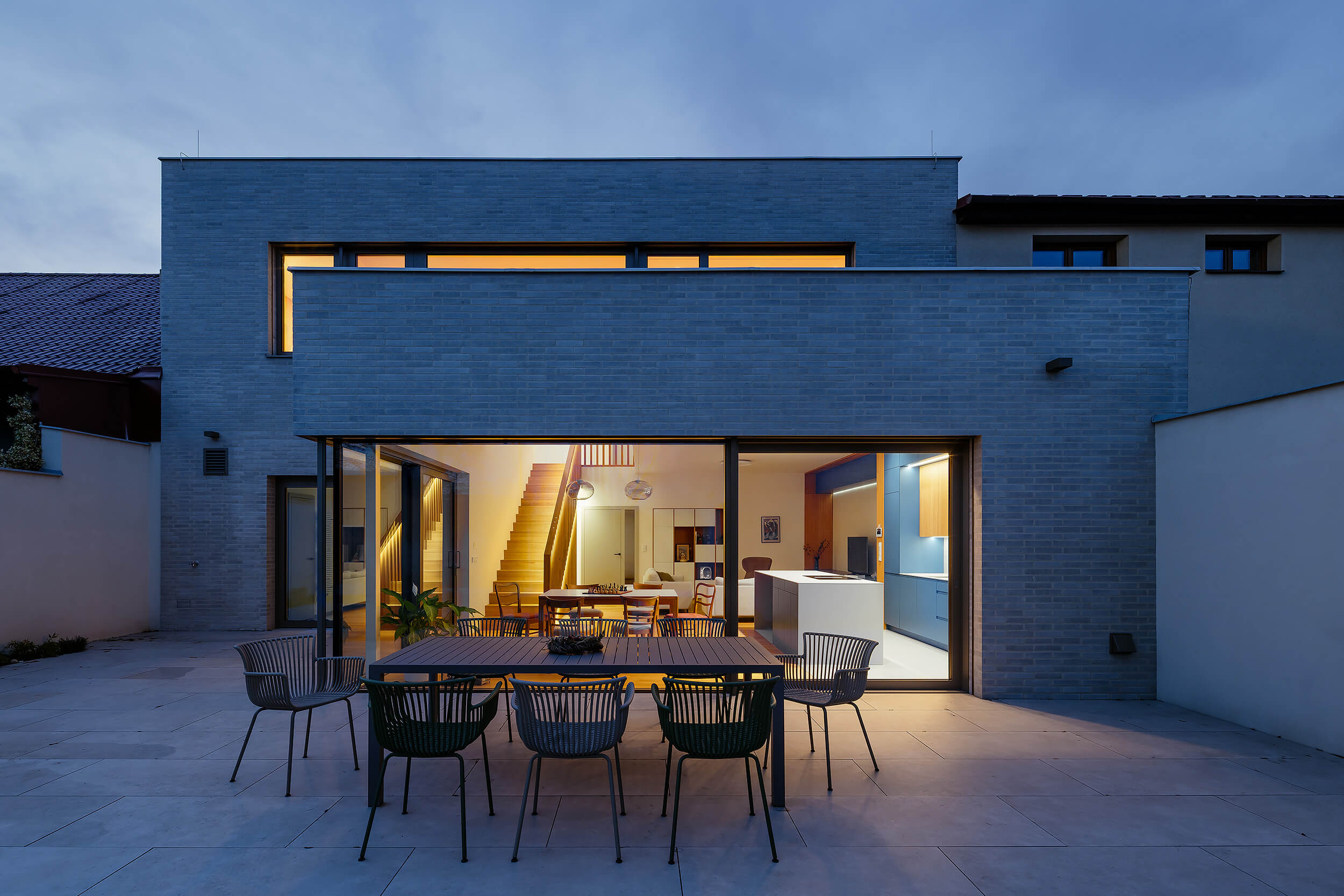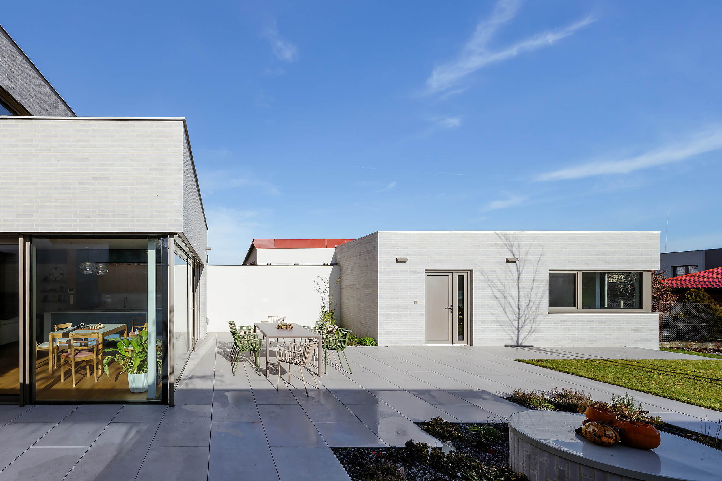 Do ulice působí poměrně uzavřeně a drží kompaktní výraz, směrem do zahrady se naopak otevírá a obrací se do klidnější části pozemku.