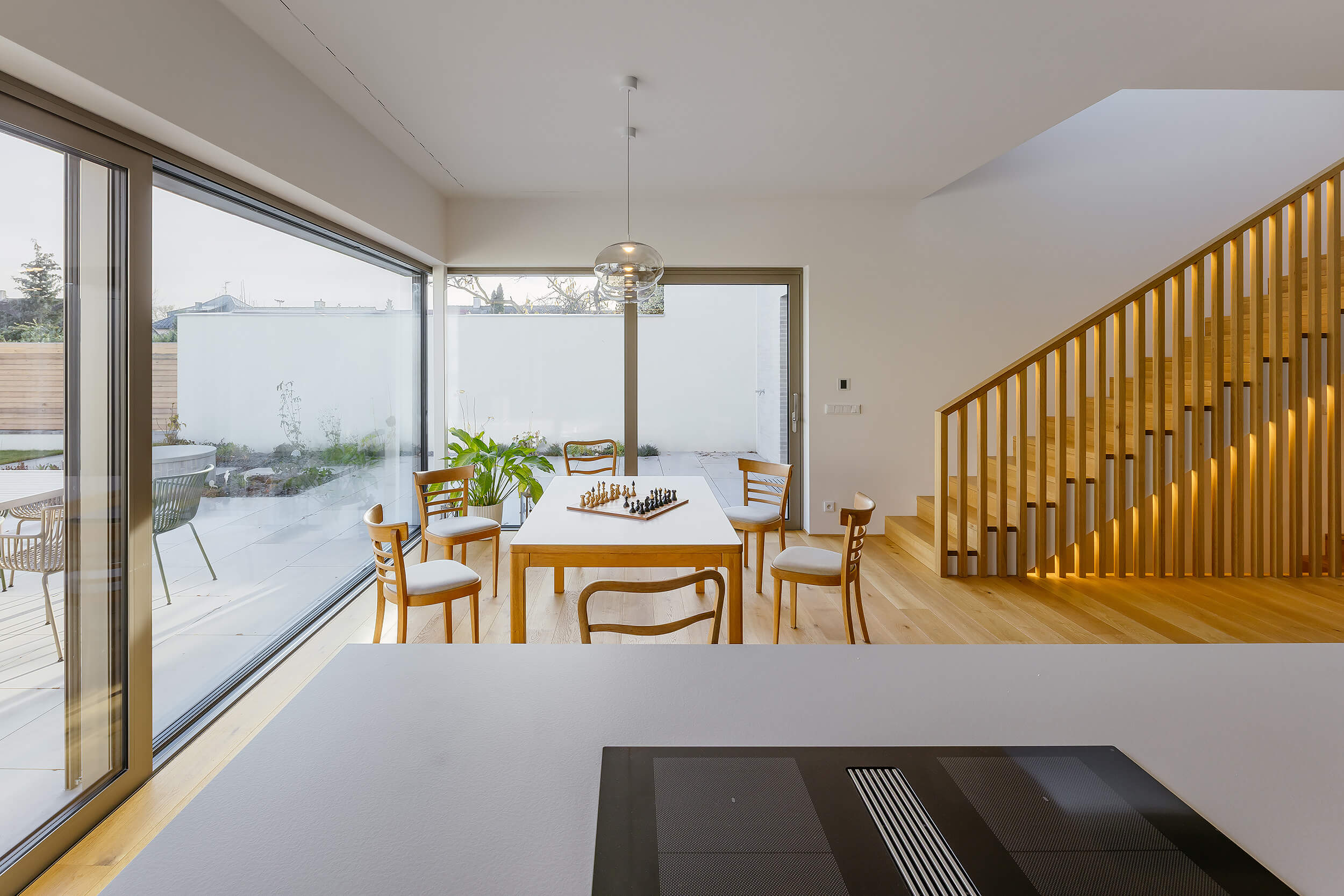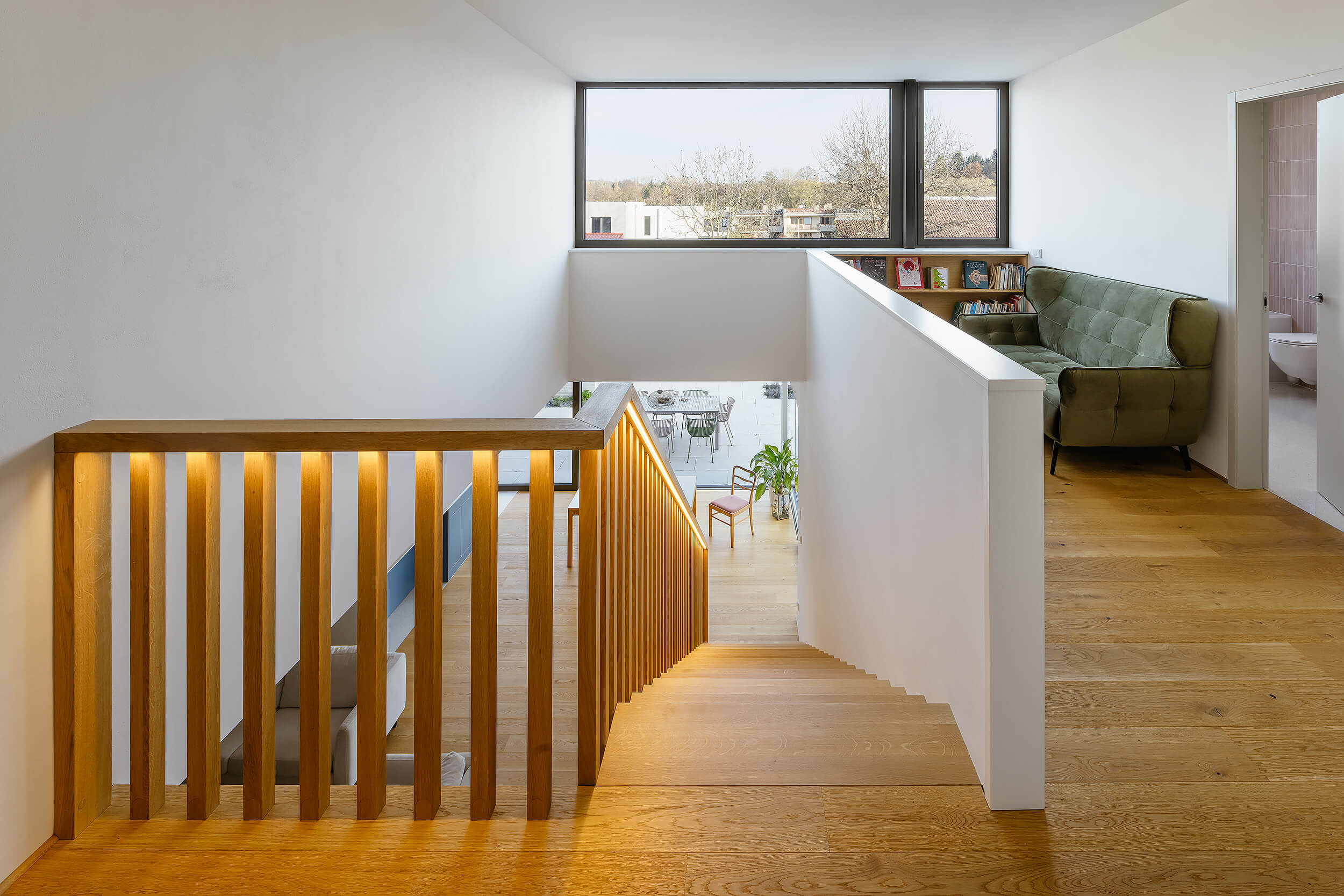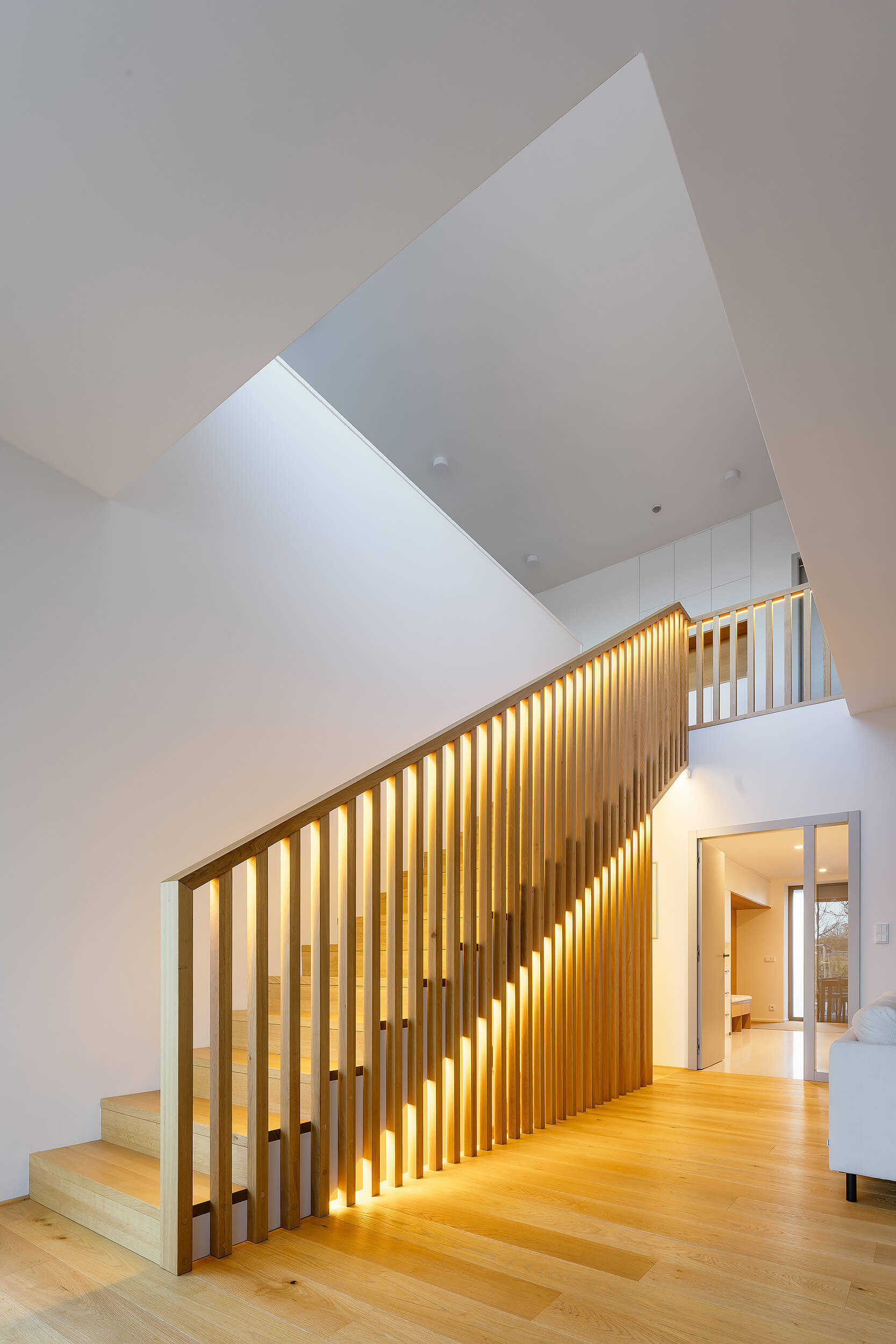 Výrazným prvkem interiéru je schodiště, které je přirozeným středem domu a zároveň velkorysým vertikálním prostorem. Otevření nad schodištěm a rozšířené zrcadlo přivádějí denní světlo hlouběji do dispozice a propojují obě podlaží i prostor domu jako celek.