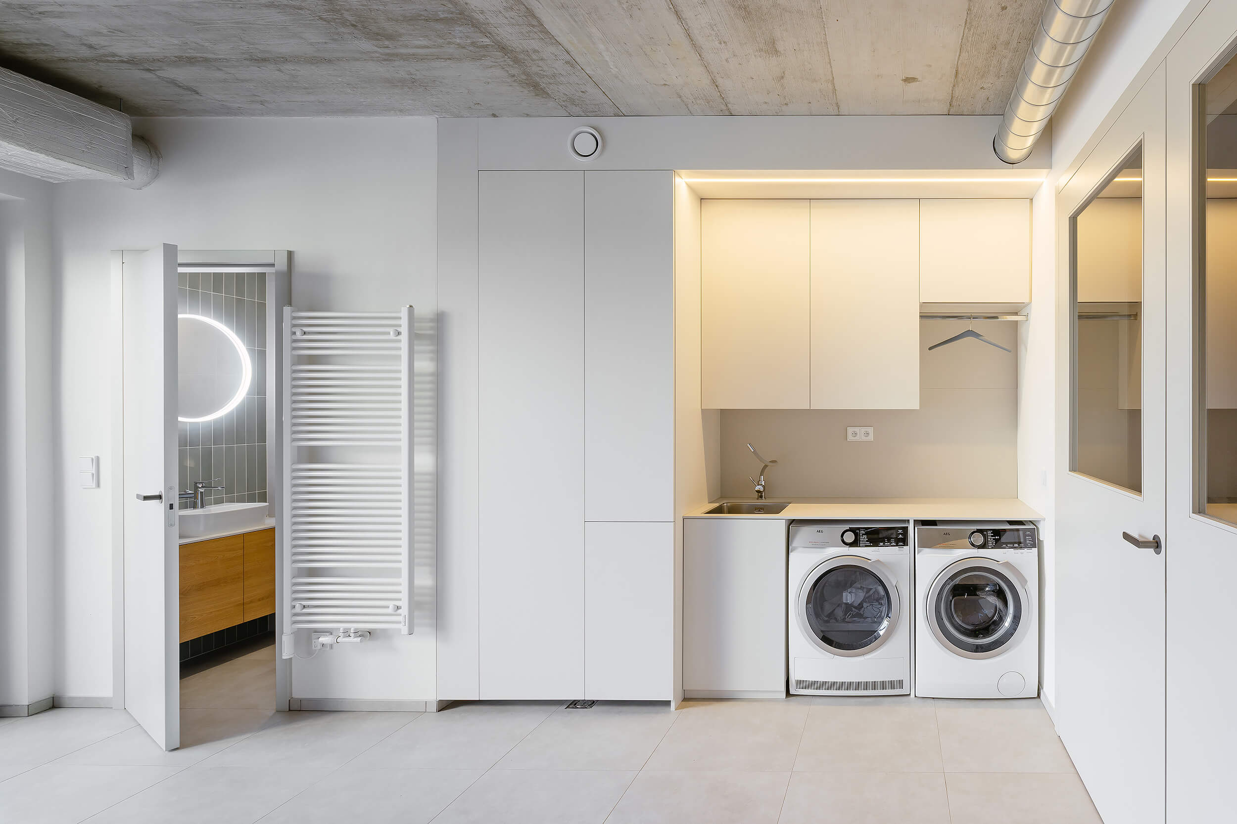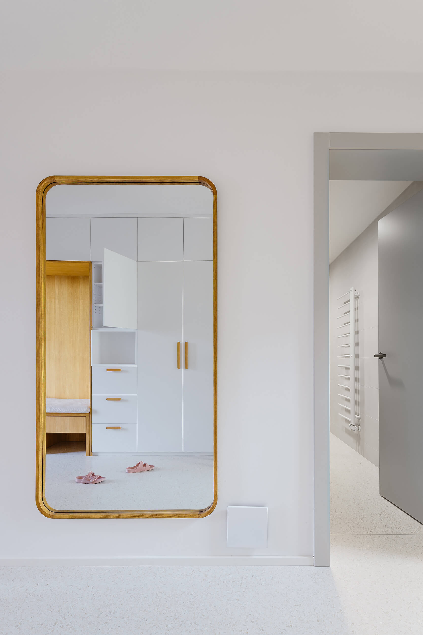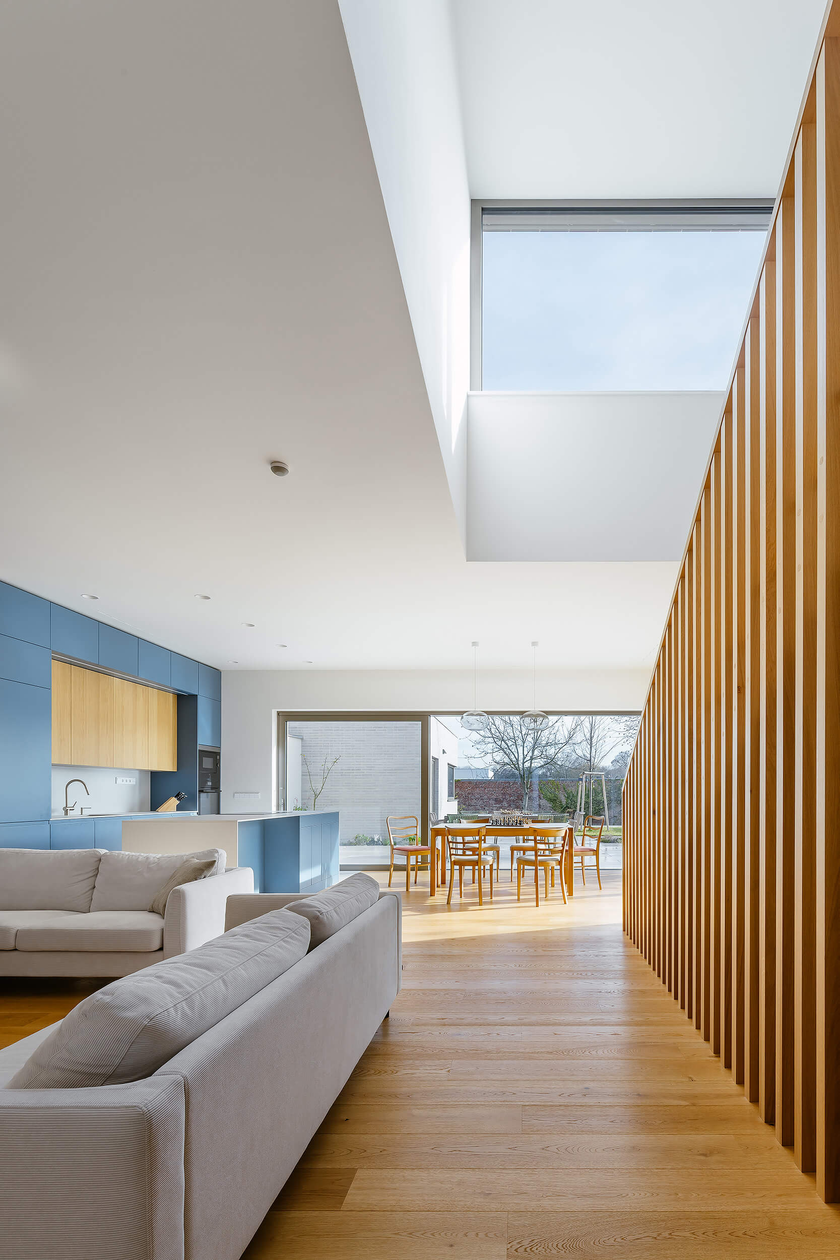 Výrazným prvkem interiéru je schodiště, které je přirozeným středem domu a zároveň velkorysým vertikálním prostorem. Otevření nad schodištěm a rozšířené zrcadlo přivádějí denní světlo hlouběji do dispozice a propojují obě podlaží i prostor domu jako celek.